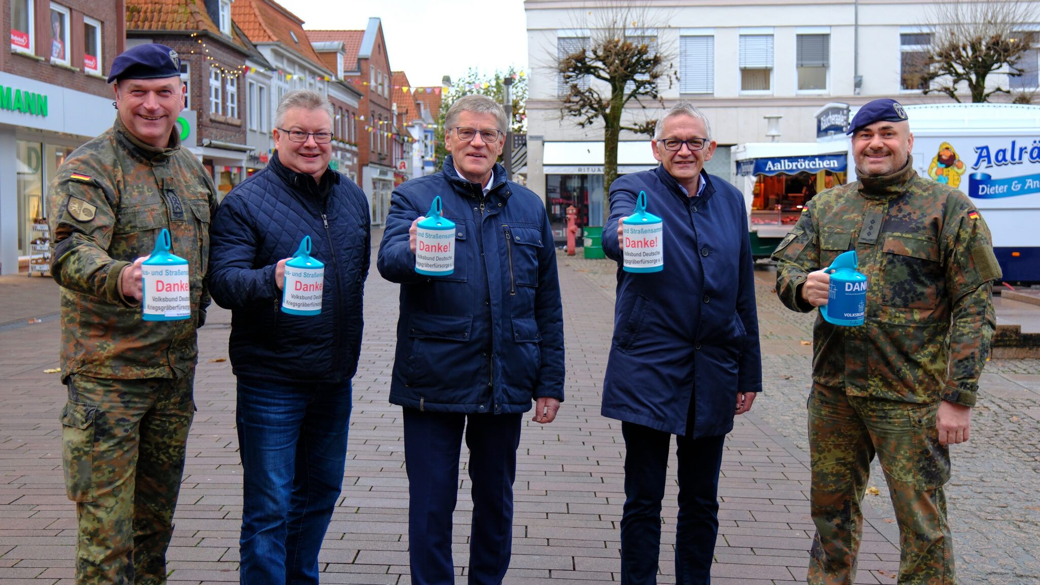 BU: Auftakt der diesjährigen Sammelaktion des Volksbundes Deutsche Kriegsgräberfürsorge auf dem Auricher Wochenmarkt: Stabsfeldwebel Udo Eilts vom Bundeswehrstandort Schortens, Jann Peter Ubben (Geschäftsführer Volksbund Kreisverband Aurich), Bürgermeister Horst Feddermann, Landrat Olaf Meinen und Hauptmann Valer Sabo.