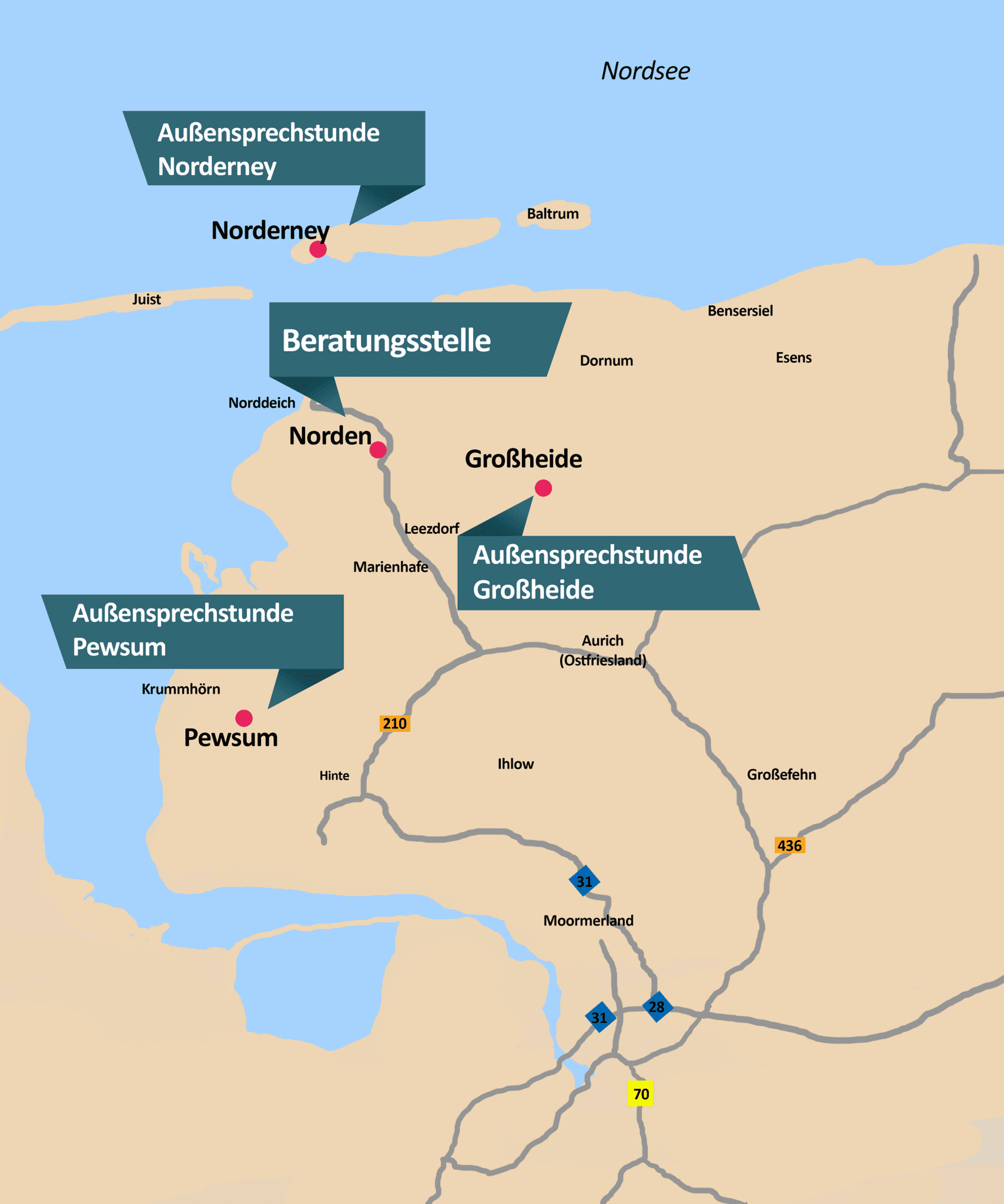 Damit uns alle Kinder, Jugendliche und Eltern gut erreichen können, gibt es neben der Hauptstelle in Norden folgende Außensprechstunden: